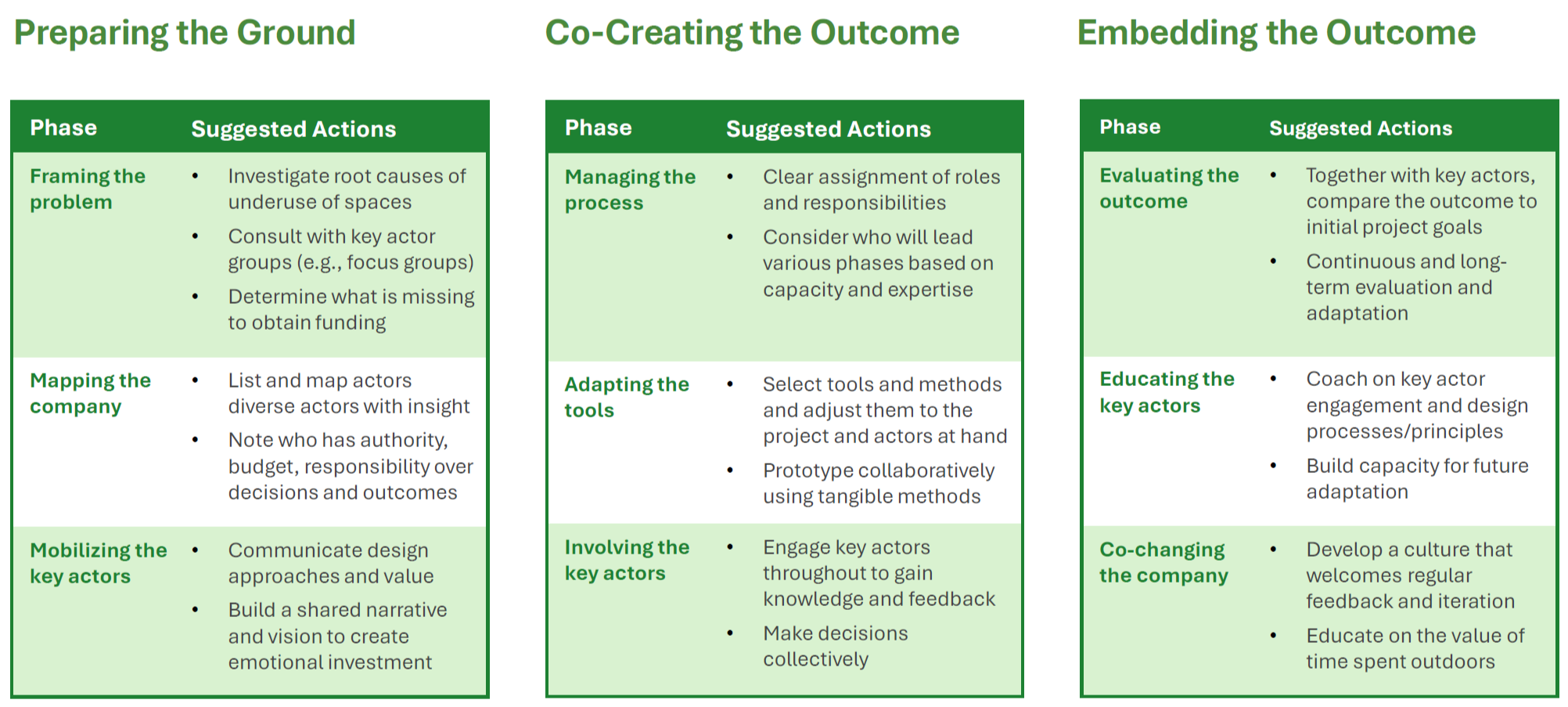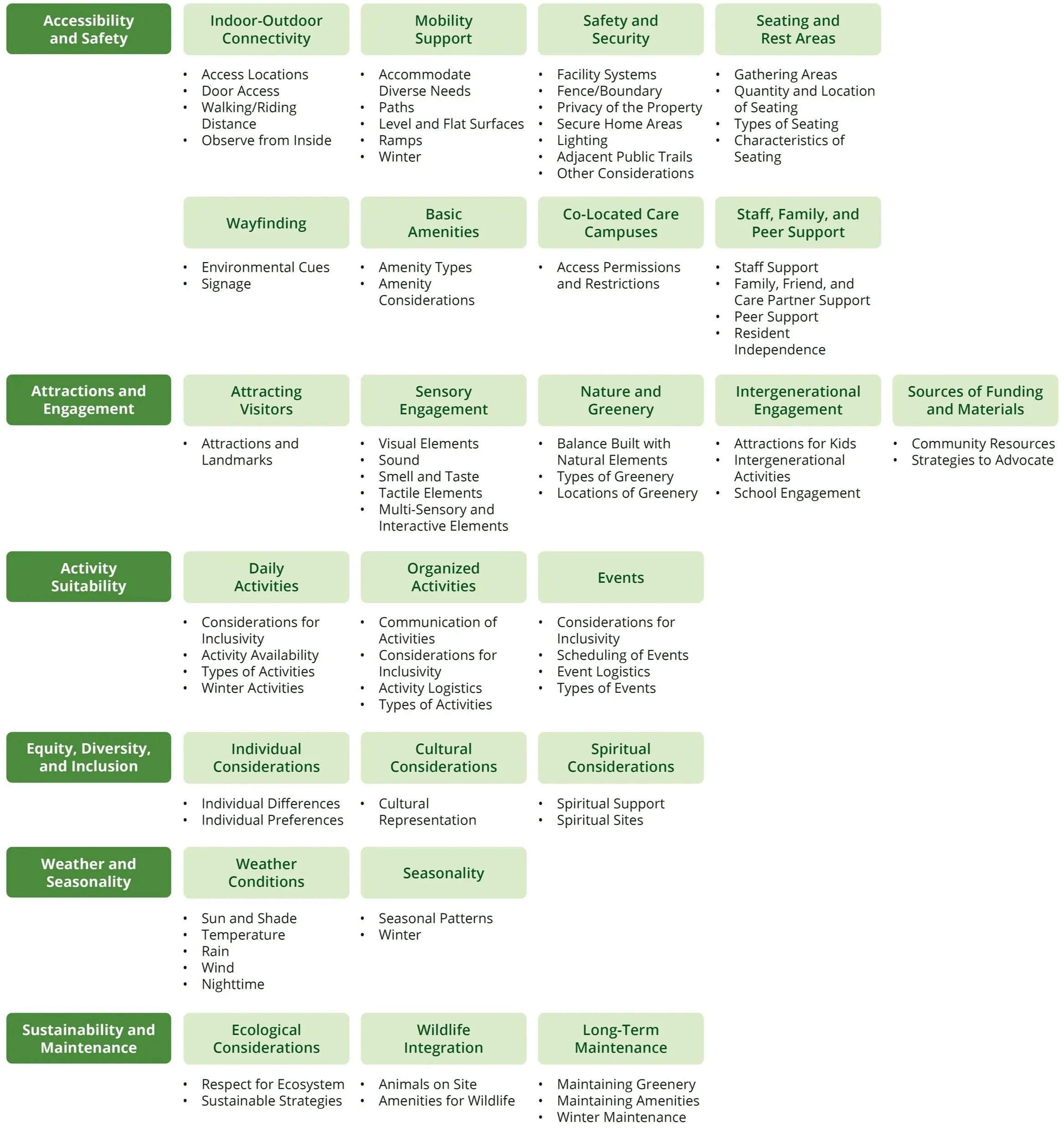 The themes identified through discussions in the activities contributed to a framework of design considerations that apply to outdoor spaces in long-term care.